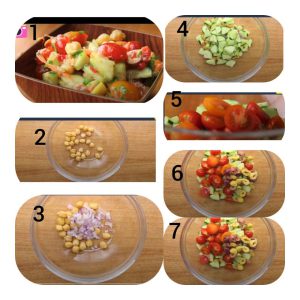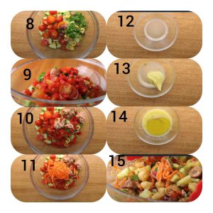 1. برای تهیه سالاد رژیمی نخود و ماهی ابتدا نخود، خیار، پیاز، گوجه گیلاسی، زیتون، جعفری خرد شده، فلفل دلمهای، کنسرو ماهی و هویج رو به ترتیب در ظرف بریزو خوب ترکیب کن.